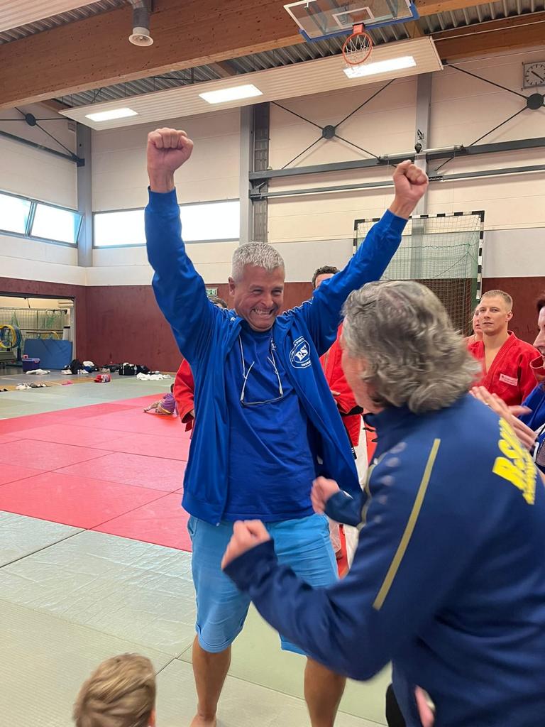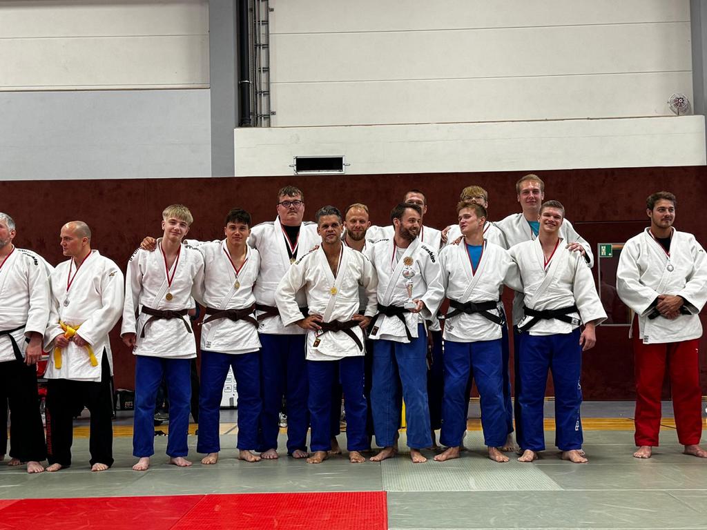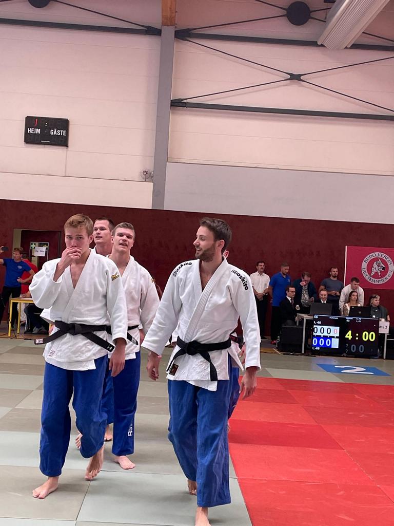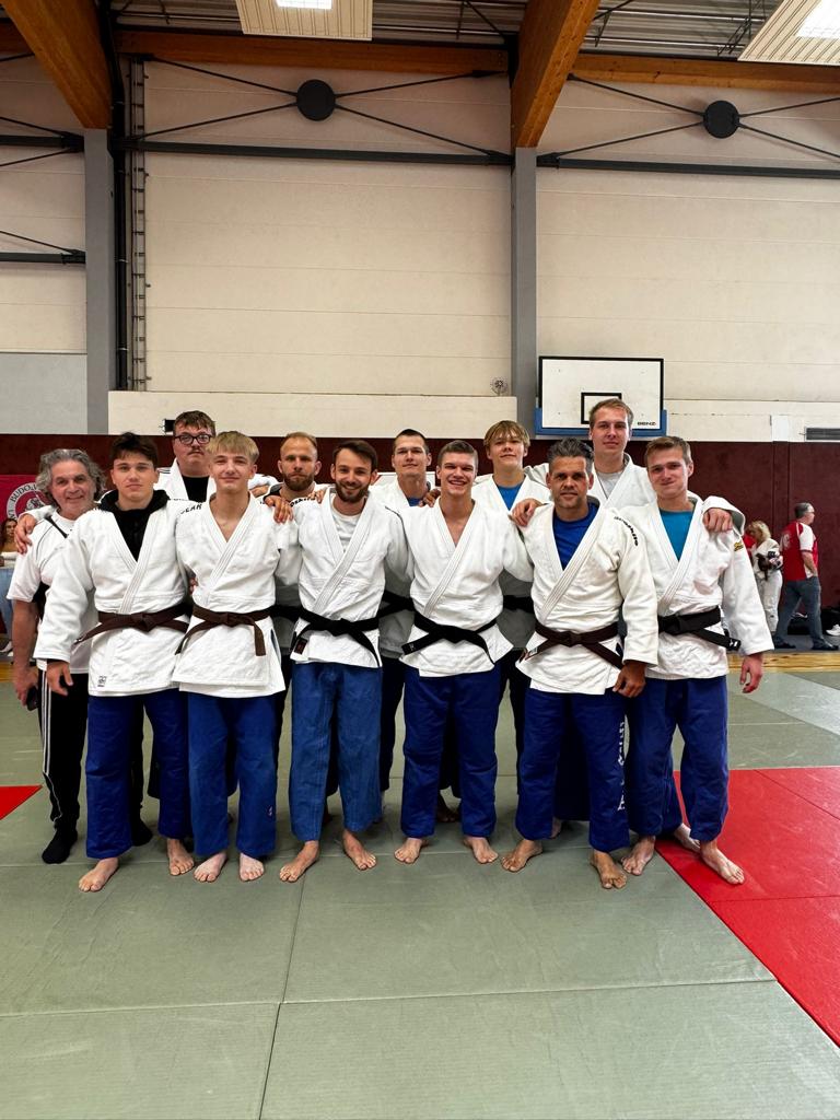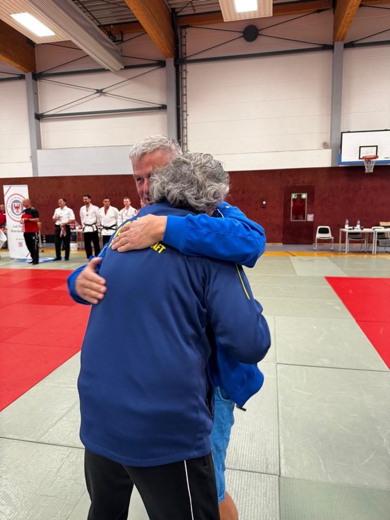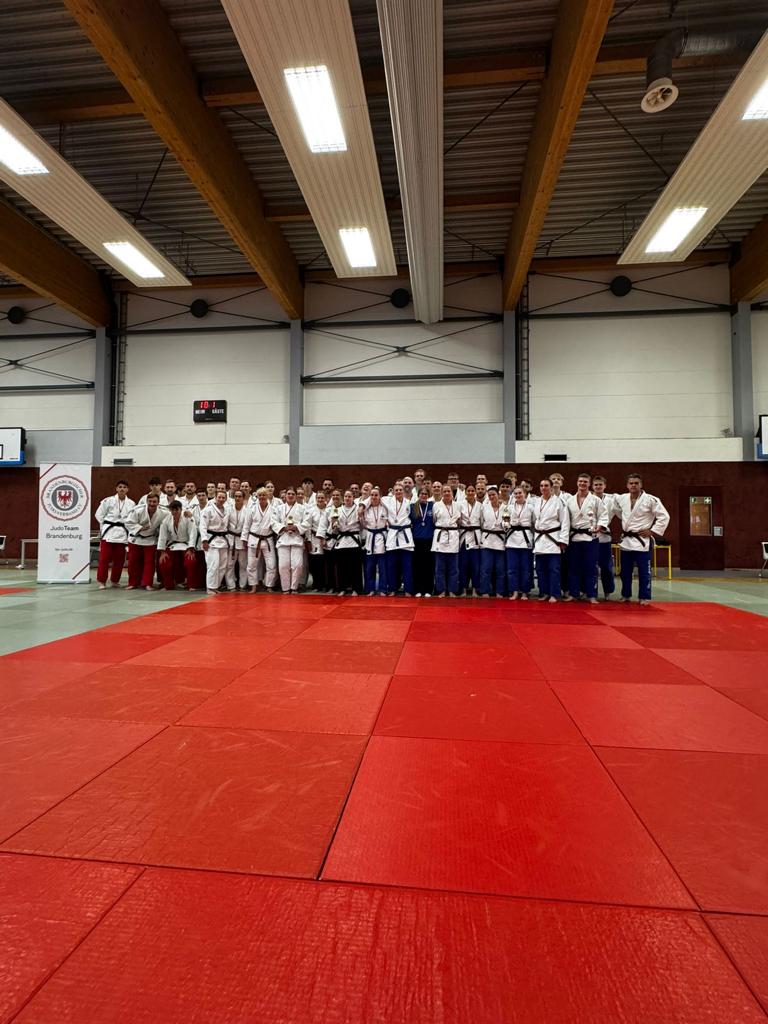 Anton bringt uns mit einem schönen Harai-Goshi und seinen letzten Reserven 1:0 in Führung. Die Halle ist mittlerweile am Toben, unsere u11er, u13er, die Mädels und alle mitgereisten Fans feuern unsere Kämpfer auf der Matte an. Leon, der nach jahrelanger Judopause wieder antritt, muss sich gegen den starken Spremberger geschlagen geben. Max, der die wichtige Aufgabe hat Ninus zu ersetzen, holt für uns den nächsten und so wichtigen Punkt mit einen schönen Ko-Uchi-Gari. Damit gehen wir 2:1 in Führung und es läuft auf einen allesentscheidenden letzten Kampf zu. Eric, bis zu diesem Zeitpunkt ungeschlagen, unter anderem mit einem Sieg gegen Jörg Frischmann aus Babelsberg, muss sich dem ebenfalls starken Spremberger geschlagen geben. Somit steht es 2:2 und der letzte Kampf -90kg entscheidet über den Titel. Oskar geht mit Waza-Ari in Rückstand, kann aber direkt im Anschluss seinen Gegner im Boden abwürgen. Mehr Spannung geht nicht. Alle Fans und Kämpfer am Mattenrand stehen Kopf, da jetzt feststeht: Wir gewinnen zum dritten Mal in Folge den Landesligatitel bei den Männern! So ein knappes Finale gab es bisher noch nicht, bei dem die Entscheidung im allerletzten Kampf des Tages fällt. Trotzdem müssen wir noch einmal bangen, da die Unterpunkte vielleicht zugunsten der Spremberger ausfallen könnten. Als dann bei der Siegerehrung das Endergebnis verkündet wird brechen alle Dämme: Wir sind zwar punktgleich mit dem Team Lausitz, da wir aber zwei gewonnene Einzelkämpfe mehr haben, bedeutet das für uns Platz 1 und somit den Titel.